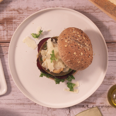 Condire il panino con la salsa, il burger di fagioli borlotti, la lattuga e petali di Grana Padano DOP.