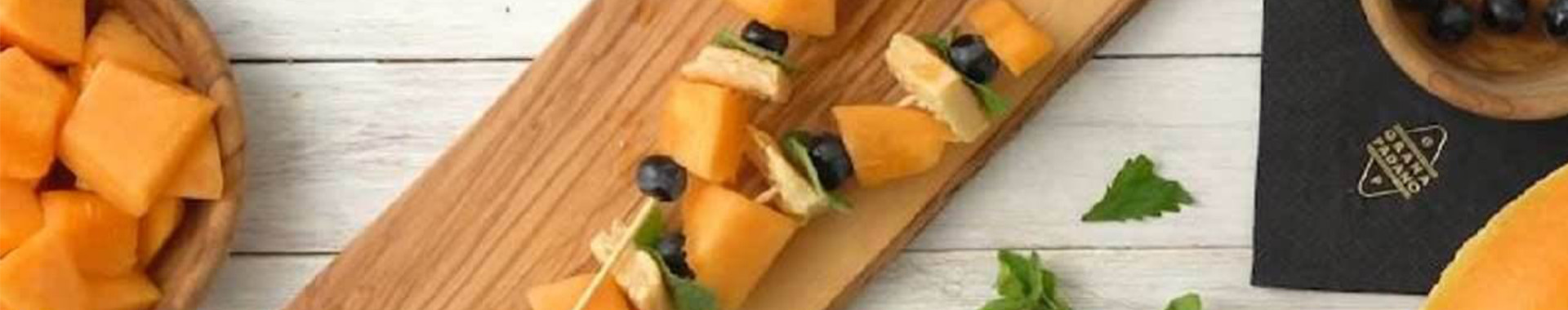 Spiedini di melone, mirtilli, menta e croste grigliate di Grana Padano